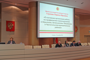 In his speech, the Minister of Justice of the Republic of Tatarstan L. Glukhov pointed out strengths and weaknesses in the work of the inter-institutional Commission for the prevention of offences, administrative commissions, voluntary people's druzhina, youth militias for the protection of public order "outpost", by using comparative tables showed the dynamics of juvenile delinquency, criminal persons, persons who have committed crimes under the influence of alcohol in designated areas.