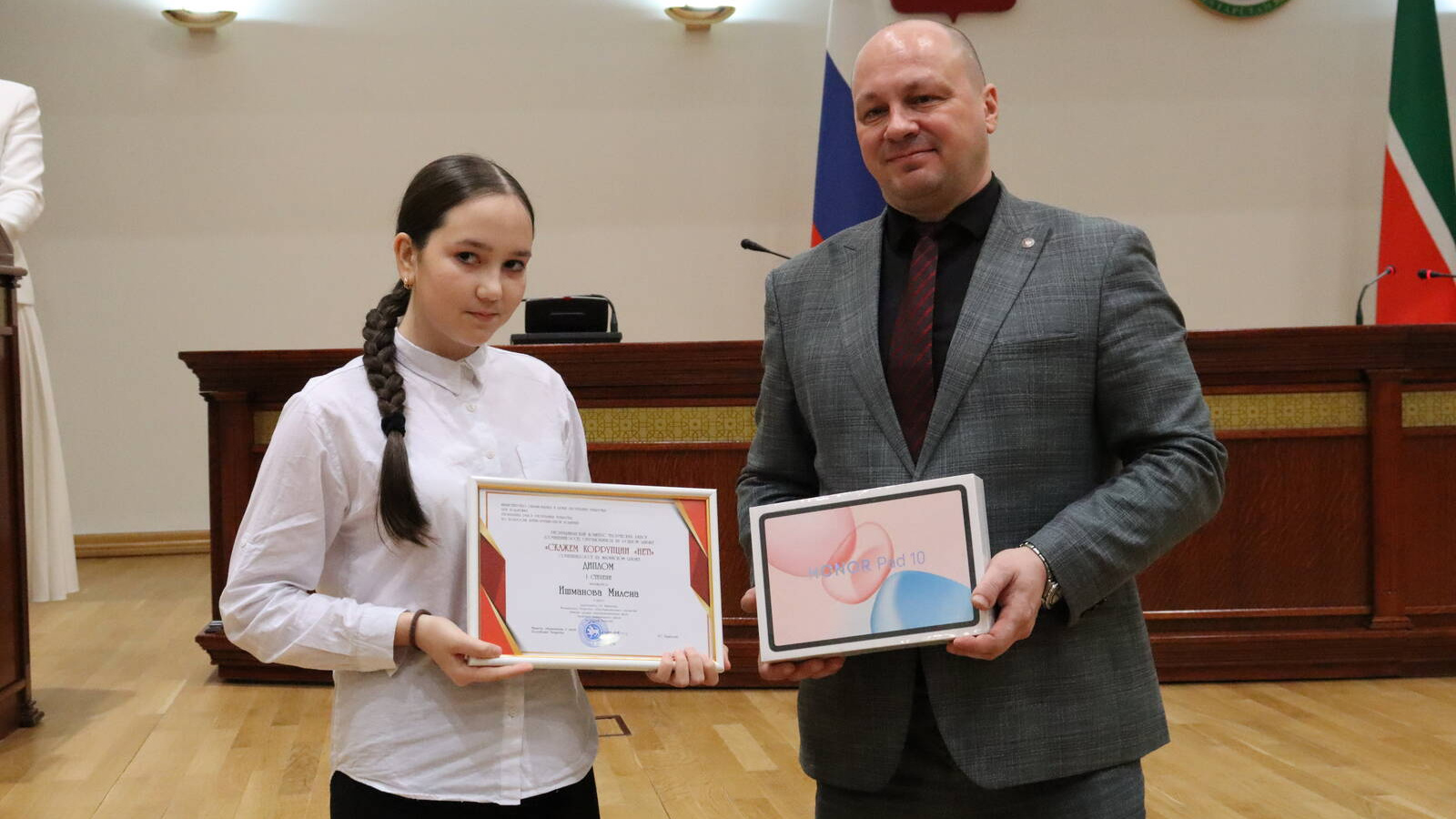 В Представительском корпусе Казанского Кремля состоялась торжественная церемония награждения победителей и номинантов республиканских творческих конкурсов антикоррупционной направленности. В мероприятии приняли участие школьники, студенты, общественники и журналисты со всей республики.