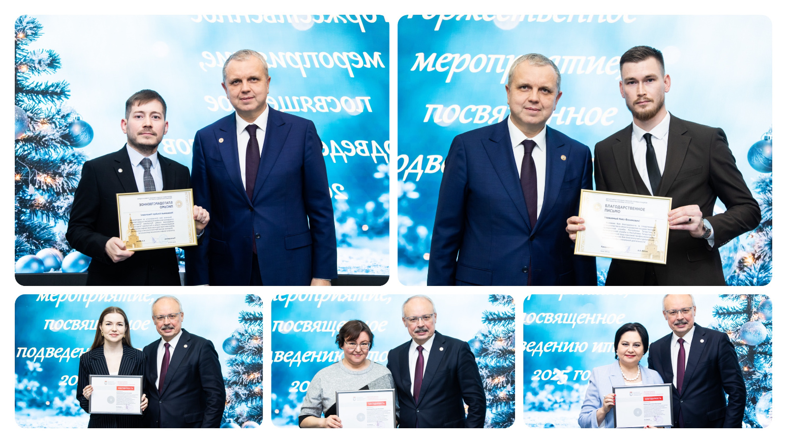 За плодотворное сотрудничество в области развития государственной гражданской и муниципальной службы Татарстана и высокий профессионализм благодарственными письмами руководителя Департамента государственной службы и кадров при Раисе Республики Татарстан Александра Белова и Высшей школы государственного и муниципального управления КФУ были отмечены 5 сотрудников Министерства: Альберт Камалутдинов, Гульнара Касымова, Ралия Гарифуллина, Лилия Мурадымова и Нияз Закиров.