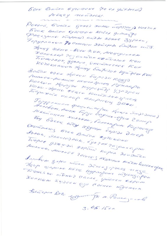 За чашкой чая Камиль Мужипович поведал о нелегкой жизни в период войны и послевоенное время. Прочитав написанный лично стих, посвященный Великой Победе, вручил его Ларисе Юрьевне на память об этом светлом дне. Писать стихи он начал с 8 лет под влиянием творчества Мусы Джалиля и личной встречи с великим поэтом.