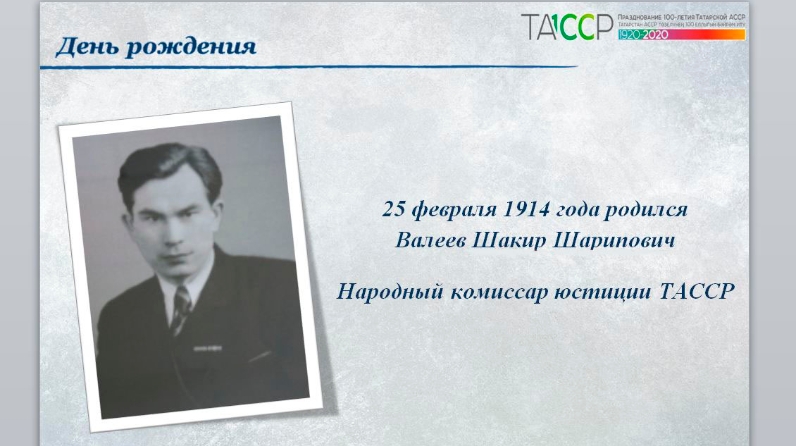 Моннан 106 ел элек бу көнне ТАССР юстиция халык комиссары Вәлиев Шакир Шәрип улы туган. Ул ведомствоны 1946 елдан алып 1950 елга кадәр җитәкли.