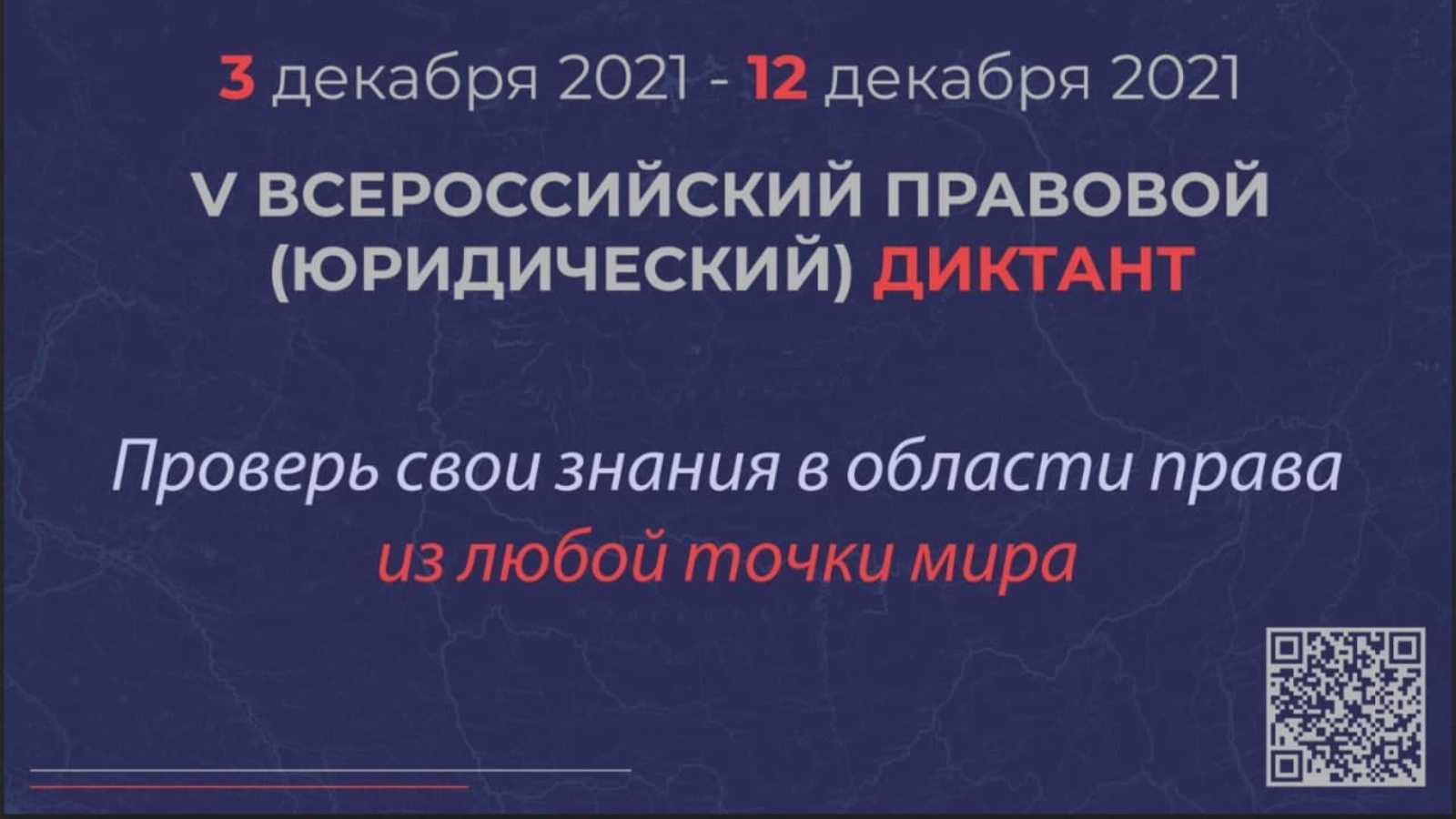 2021 елның 3-12 декабрендә 14 яшьтән узган һәм теләге булган һәр кеше V Бөтенроссия хокукый (юридик) диктантын язуда катнаша һәм үзенең юриспруденциядә белемнәрен тикшерә ала.
