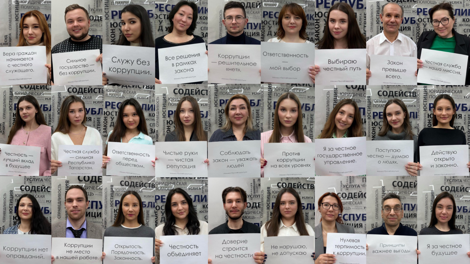 Министрлык хезмәткәрләре акциядә актив катнашып, коррупциягә каршы лозунглар белән фотосурәтләр сериясен булдырдылар. Фотоларда Татарстан Юстиция министрлыгы вәкилләре “Без коррупциягә каршы”, “Намуслылык миннән башлана”, “Законлы юлны сайлыйм” дигән мөһим иҗтимагый чакырулар язылган плакатлар тотып торалар.